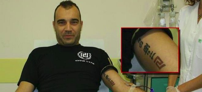 Αυτός στη φωτογραφία είναι ο χρυσαυγίτης βουλευτής Ηλιόπουλος. Ποζάρει με τατουάζ το «Sieg Heil!» (σσ: «Ζήτω η νίκη»). Πρόκειται για σύνθημα τόσο ναζιστικό και τόσο εθνικοσοσιαλιστικό που αποτελούσε τον καθεαυτό χαιρετισμό των Ναζί που καθιερώθηκε από τον Χίτλερ και απαγορεύτηκε στη Γερμανία, μετά τη λήξη του Β’ Παγκοσμίου Πολέμου, με τις παραγράφους 86 και 130 του γερμανικού Ποινικού Κώδικα. Ναζισταράς κανονικός, δηλαδή.